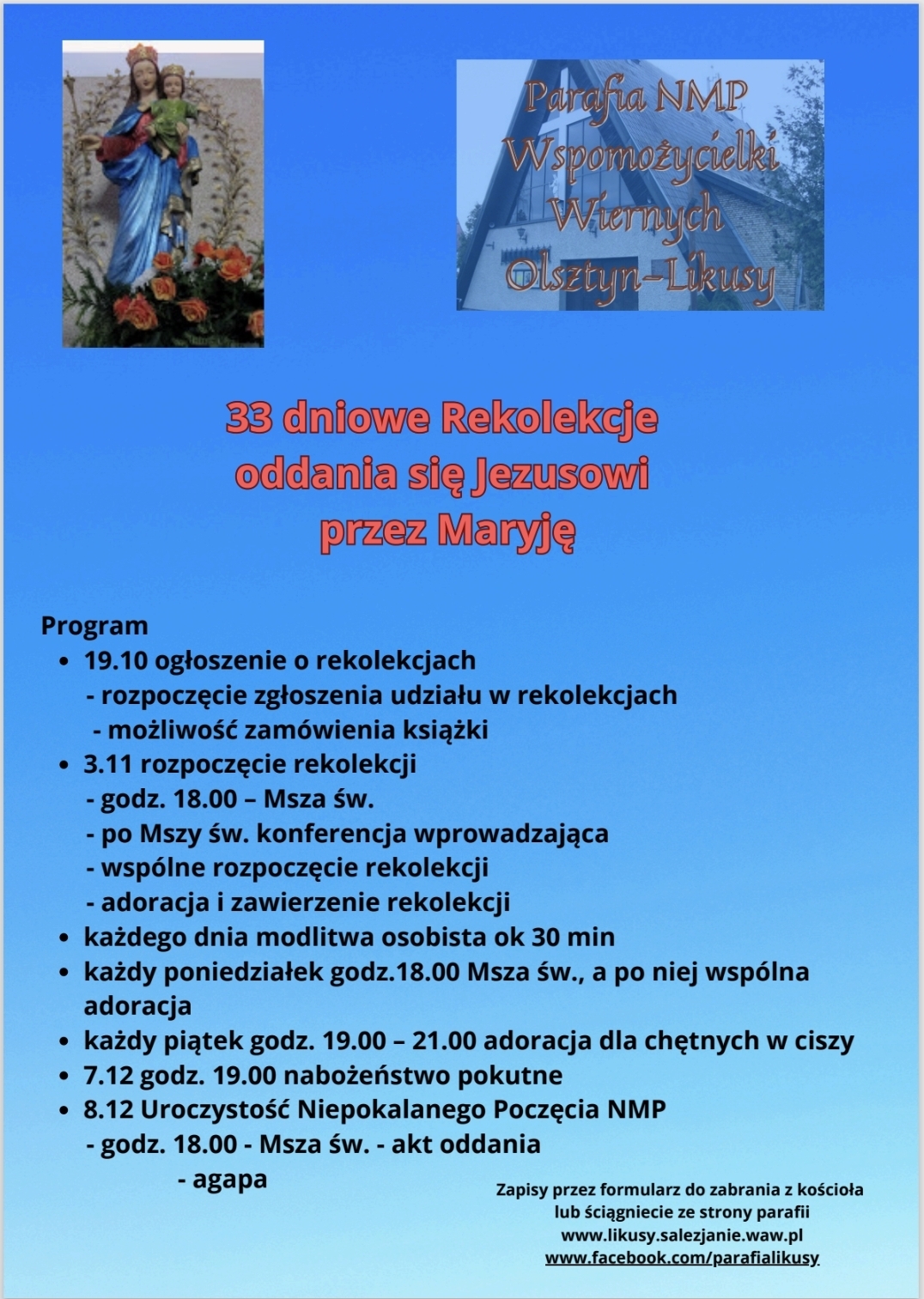 Kolejny raz w naszej parafii będziemy przeżywać 33 dniowe rekolekcje przygotowujące do oddania życia Jezusowi przez Maryję – rozpoczną się one 3 listopada zachęcam do ich podjęcia. Więcej informacji znajduje się w naszej gazetce Echo Wspomożycielki. Na stoliku leżą karty zgłoszeniowe, takie karty będzie można pobrać także ze stron internetowych parafii. Rekolekcje mogą też posłużyć do odnowienia aktu.