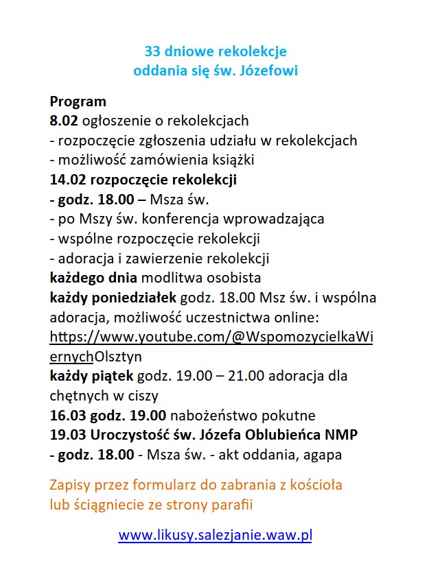 33 dniowe Oddanie zaczynamy Eucharystią 14.02 o 18:00. Po Mszy św. będzie świadectwo Marcina Jaguszewskiego o działaniu wstawiennictwa św. Józefa.