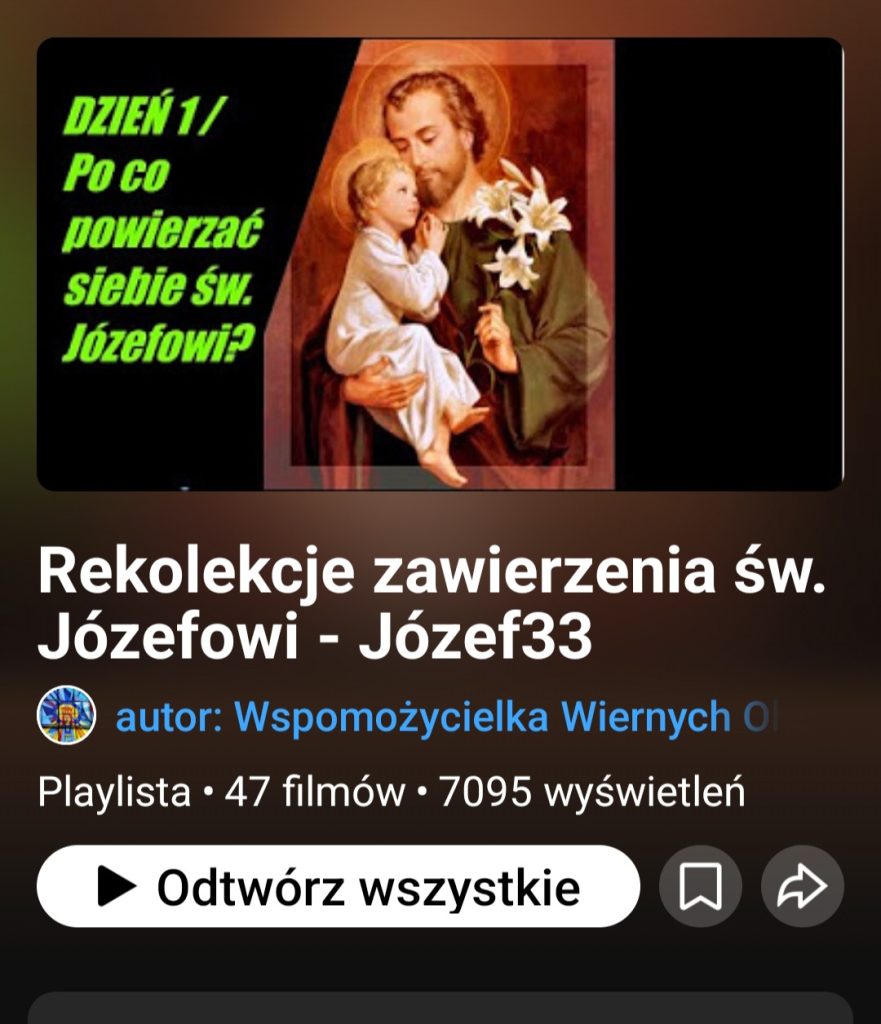 Podajemy link do naszej strony na YouTube – do playlisty z nagraniami do 33 dniowych rekolekcji oddania się św. Józefowi.